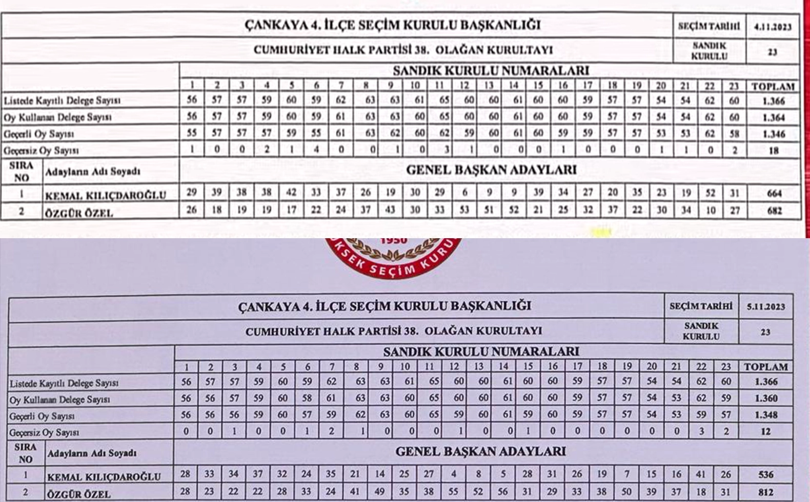 CHP’de ikinci tur seçim sonuçları açıklandığında sonuç Özel lehine 812’ye 536’ydı. İlk turda seçimlerden önce “Salon da delege de ikiye bölündü: CHP liderini arıyor” başlıklı haberde söylediğimiz gibi başa baş bir yarış geçti. İlk tur sonucunda 682 oy alan Özel’in karşısında Kılıçdaroğlu 664 oyda kalmıştı.