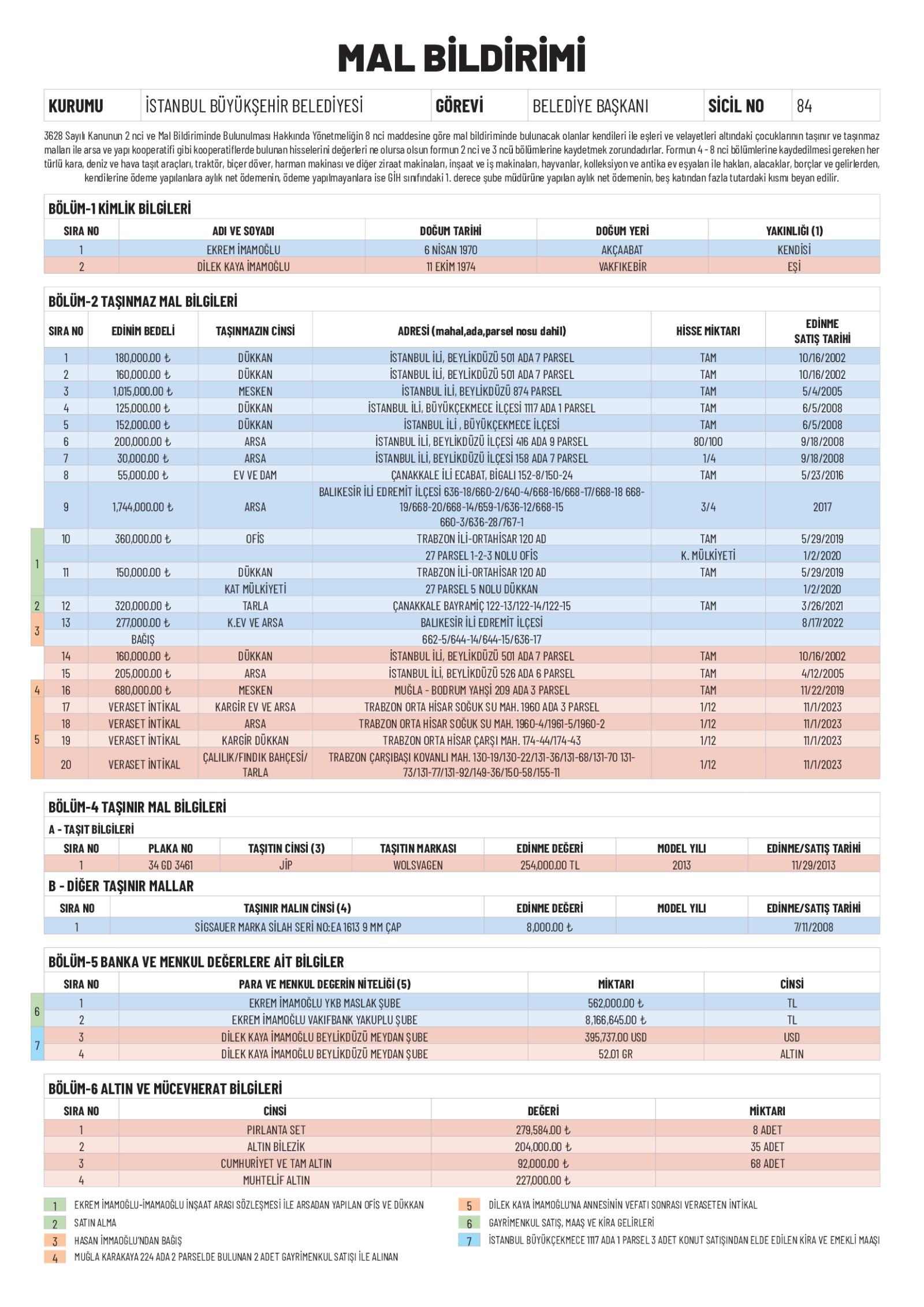 İmamoğlu’nun Büyükçekmece’de iki dükkan, Beylikdüzü’nde iki dükkan ve bir mesken, Beylikdüzü’nde iki arsa, Balıkesir’de arsa, Çanakkale’de ev ve tarla, Trabzon’da ofis ve dükkan, Balıkesir’de ev ve arsası olduğu görüldü.