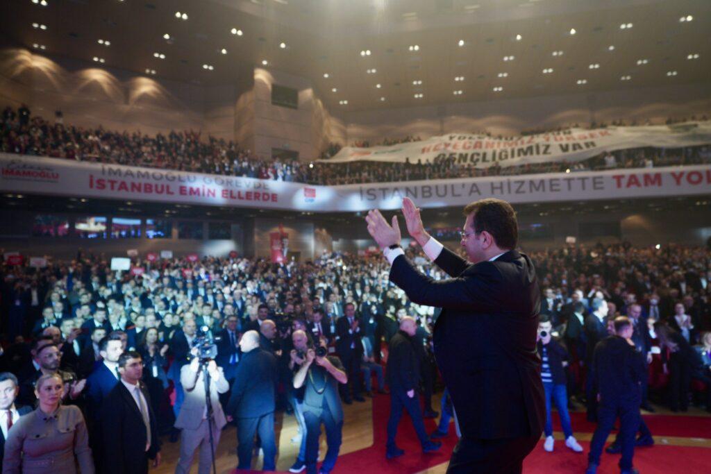 Haliç Kongre Merkezi’ni dolduran partililer uzun süre İmamoğlu’nu alkışladı.