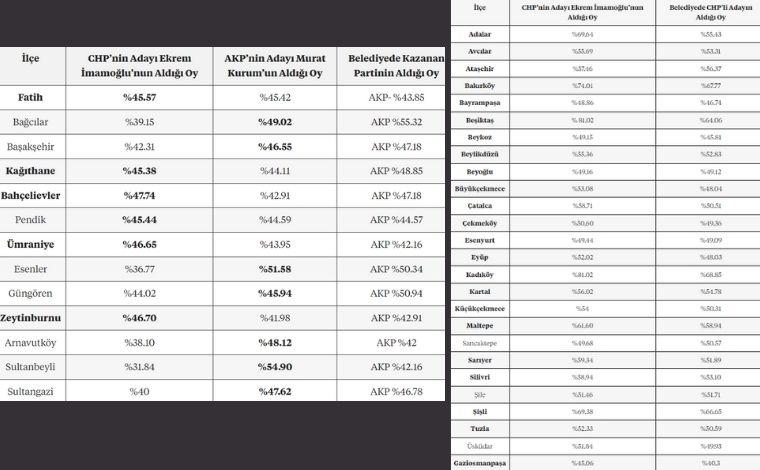 Buna göre İmamoğlu’nun İstanbul’un 39 ilçesinin 32’sinde Kurum’dan daha fazla oy aldığı anlaşılıyor.