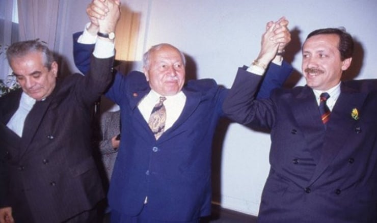Fotoğrafta o tarihte Refah Partisi genel başkanı olan Erbakan, görevi devreden SHP’li Nurettin Sözen’in ve İBB seçimlerini kendi partisinden kazanan Erdoğan’ı tebrik ediyor.