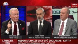 Programda gazeteci Uğur Dündar, İnce’ye Millet İttifakı’nı FETÖ ile işbirliğiyle suçluyorsanız belge çıkarmalısınız” dedi.