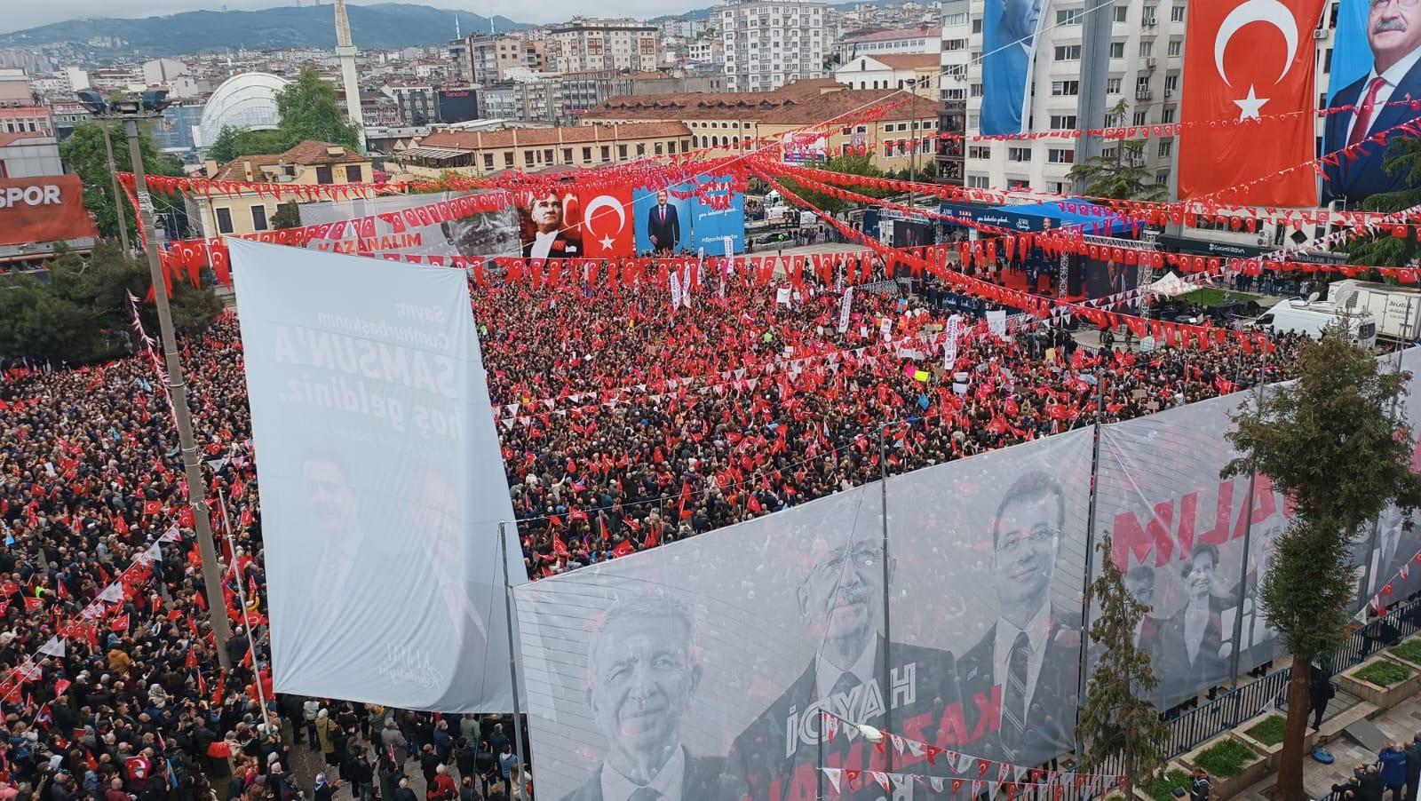 Millet İttifakı’nın Cumhurbaşkanı adayı Kemal Kılıçdaroğlu seçimlere iki gün kala Saadet Partisi Genel Başkanı Temel Karamollaoğlu, Gelecek Partisi Genel Başkanı Ahmet Davutoğlu ve İstanbul Büyükşehir Belediye Başkanı Ekrem İmamoğlu ile birlikte Samsun’da miting düzenledi.