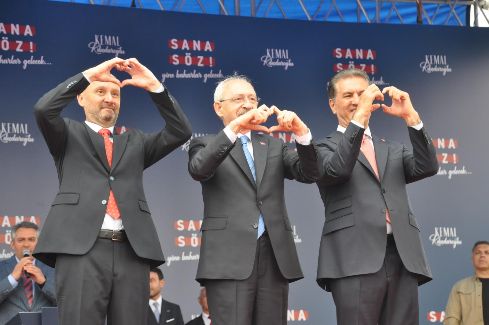 Erzincan’daki miting kürsüsünde Kılıçdaroğlu’na CHP milletvekili adayları Mustafa Sarıgül ve Ufuk Aktaş eşlik etti.