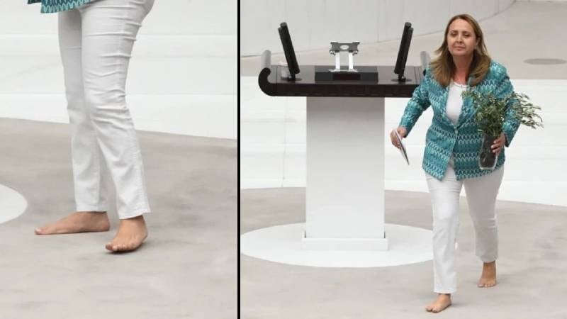 CHP Ankara Milletvekili Semra Dinçer, TBMM Genel Kurulu’nda zeytinlik alanların madencilik faaliyetine açılmasını da kapsayan torba kanun teklifini protesto etmek için kürsüye çıplak ayakla ve zeytin dalıyla çıktı.