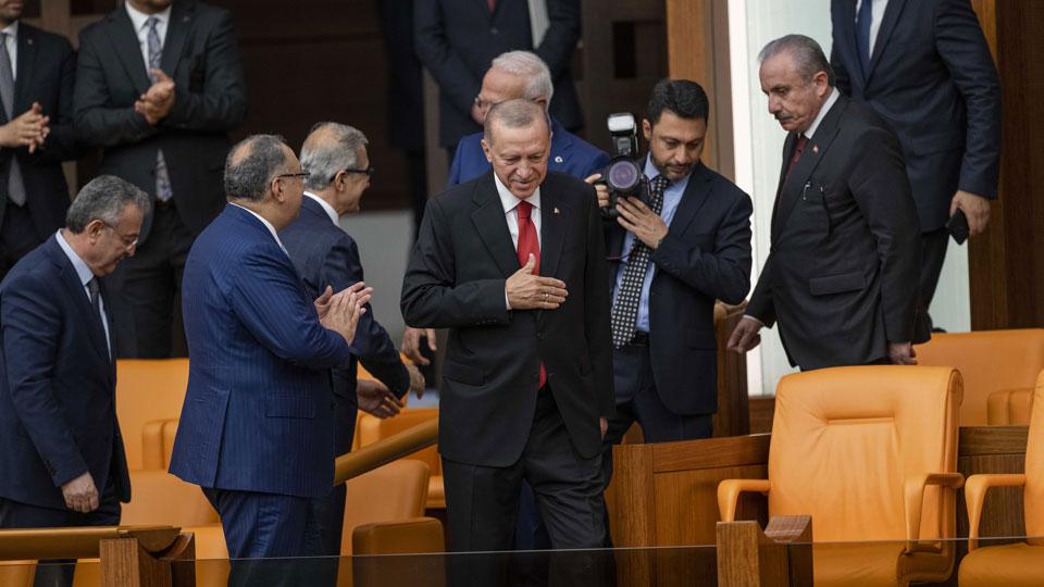 Geçici Meclis Başkanı Devlet Bahçeli tarafından resmi tören eşliğinde karşılanan Erdoğan’a Genel Kurul’a girişte geçici başkanlık divanından Yeniden Refah Partisi Milletvekili Suat Pamukçu eşlik etti. Pamukçu, locada da Erdoğan’ın yanında oturdu. Erdoğan AK Parti milletvekilleri tarafından ayakta alkışlanarak karşılandı.