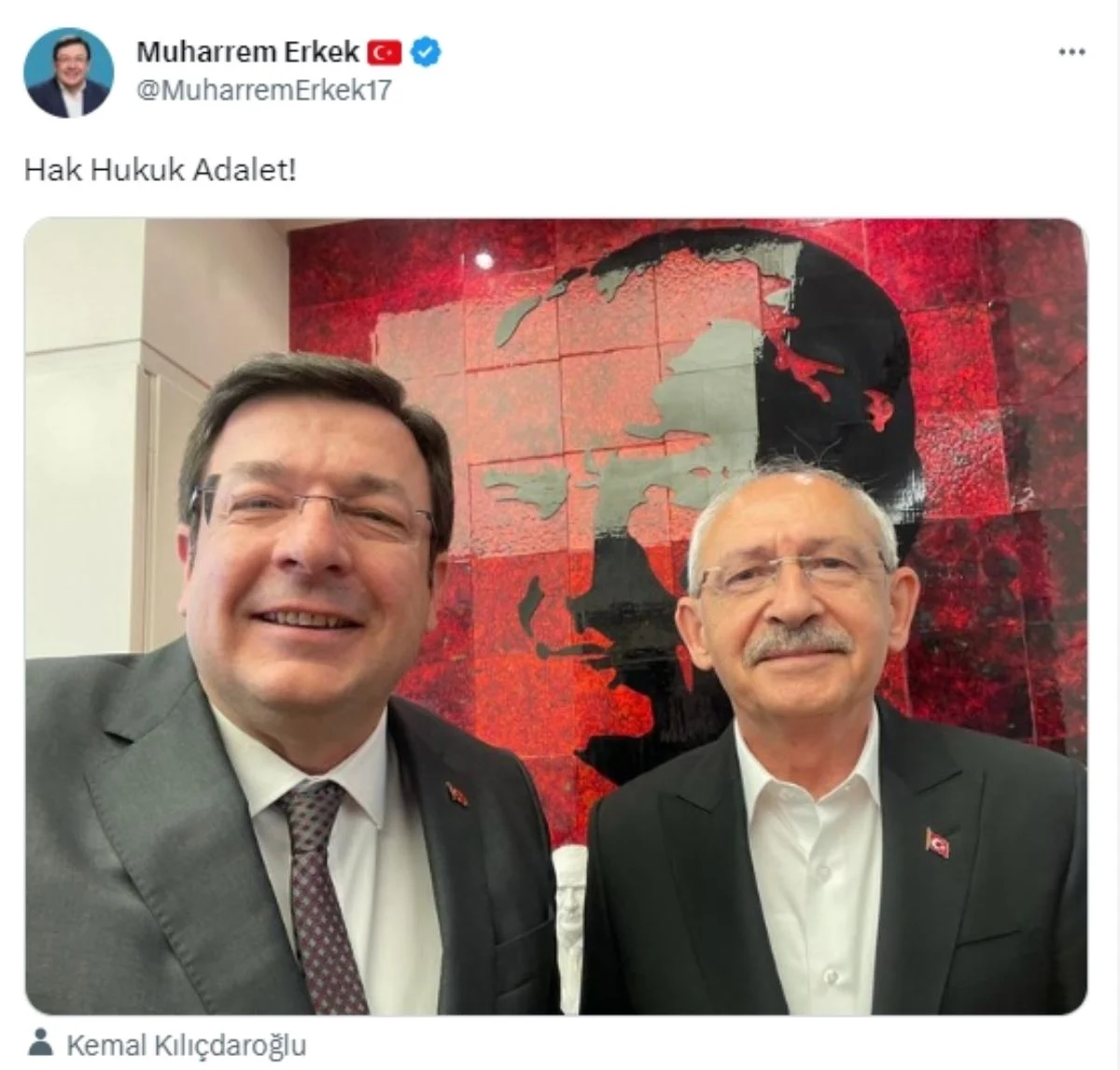 CHP Genel Başkan Yardımcısı Muharrem Erkek, “Hak, hukuk, adalet” notuyla paylaştığı Kemal Kılıçdaroğlu ile olan fotoğrafını gelen tepkiler üzerine kaldırdı. Muharrem Erkek'e tepki gösterenler arasında Kılıçdaroğlu'nun 14 Mayıs seçimlerinin ardından aradığı Jahrein adlı sosyal medya fenomeni de vardı