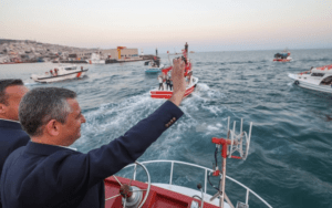 Yozgat mitingine traktörle giden CHP lideri Özgür Özel, Sinop’ta da av yasağının kalktığı ve balıkçıların ‘Vira Bismillah’ diyeceği 1 Eylül’ün arifesinde anlamlı bir adres tercih etti. Özel, balıkçılığın önemli bir geçim kaynağı olduğu Sinop’ta, miting alanına balıkçı teknesiyle gitti. Özgür Özel’e Sinoplu balıkçılar da tekneleriyle eşlik etti. Eski Genel Başkan Hikmet Çetin de mitinge katıldı.