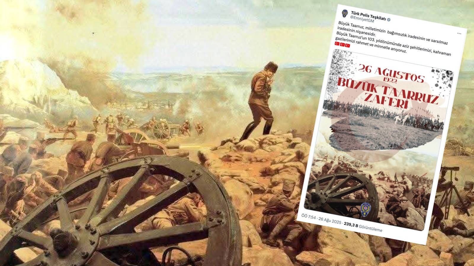 Türk Polis Teşkilatı, Büyük Taarruz Zaferi anması için sosyal medyadan yaptığı paylaşımda orijinalinde olmasına rağmen tabloyu değiştirerek Atatürk’e yer vermedi ancak tepkiler üzerine paylaşım kaldırıldı. Atatürk’ün de yer aldığı yeni paylaşımda “Milletimizin bağımsızlık mücadelesinin simgesi olan Büyük Taarruz’ un 103. Yıl Dönümü kutlu olsun. Başta Gazi Mustafa Kemal Atatürk ve silah arkadaşları olmak üzere aziz şehitlerimizi ve kahraman gazilerimizi minnet ve şükranla anıyoruz” denildi.