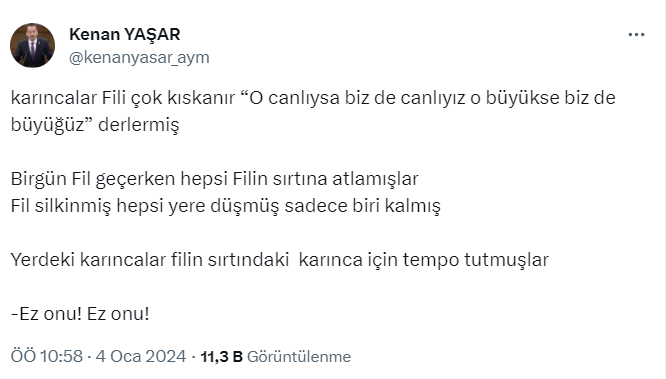 Yargıtay 3. Ceza Dairesi ile Anayasa Mahkemesi (AYM) arasındaki çekişme sürerken AYM üyesi Kenan Yaşar sosyal medya hesabından bir paylaşım yaptı. Paylaşımın konusu karıncalar ve fil arasında geçen bir masaldı; “Yerdeki karıncalar filin sırtındaki karınca için tempo tutmuşlar -Ez onu! Ez onu!” sözleri dikkat çekti. Kenan Yaşar daha sonra paylaşımını kaldırdı.