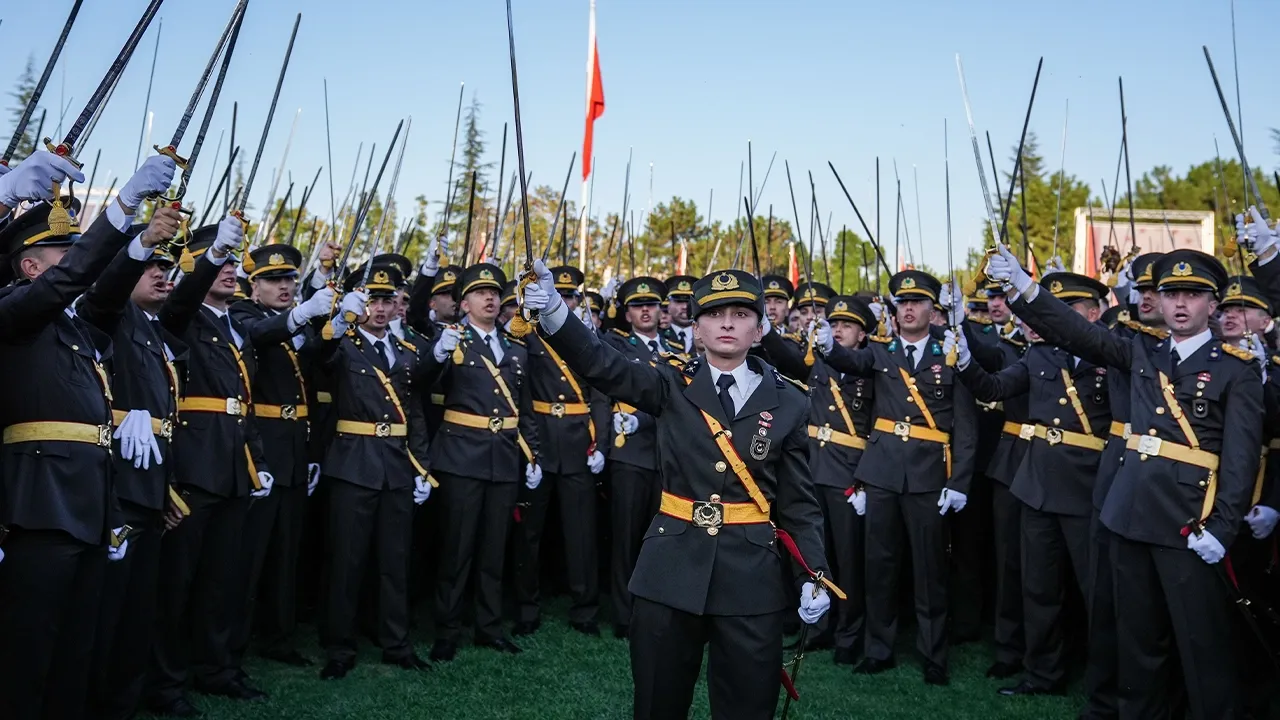 Genç teğmenler de günü geleneksel olarak askeri okullarda yapılan ‘kılıç çatma’yla bitirdi. Peşinden bayrağı ve şeref tribününü selamladılar, halka olup “Mustafa Kemal’in askerleriyiz” sloganları attılar. Okul birincisi Teğmen Ebru da kalabalığın ortasına geçerek az evvel Erdoğan’ın önünde okudukları subay yemininin benzerini silah arkadaşlarına tekrar ettirdi: