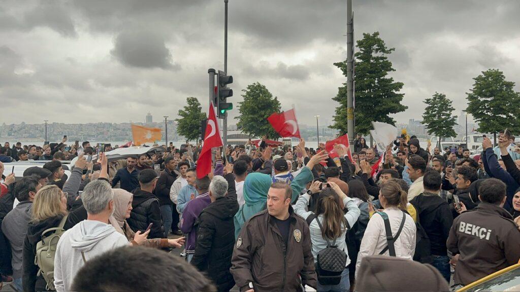 Cumhurbaşkanı Recep Tayyip Erdoğan, ise ilk zafer konuşmasını İstanbul Kısıklı’da kutlama için kendisini bekleyen binlerce yurttaşın huzurunda yaptı. Meydanda çalınan şarkıya başından sonuna kadar eşlik eden, yer yer hoparlörlerin kısılmasıyla şarkıyı tek başına söyleyen Erdoğan’ın buradaki konuşmasında bir yandan “Kazanan Türkiye’dir” derken, diğer yandan seçim sürecinde muhalefete karşı kullandığı sert dili devam ettirmesi dikkat çekti.
