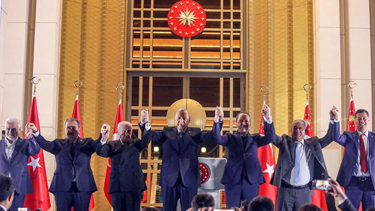 Erdoğan, zaferini son anda saflarına katılan Sinan Oğan’dan tartışmaların odağındaki HÜDA PAR Genel Başkanı’na kadar Cumhur İttifakı bünyesindeki tüm liderlerle birlikte halkı selamlayarak kutladı.
