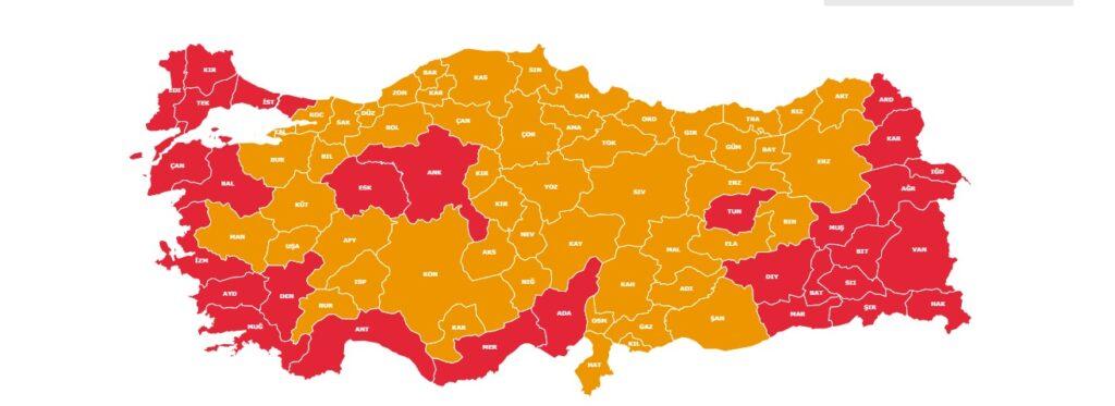 Anadolu Ajansı’nın sandıkların yüzde 99’undan gelen verilere göre şekillendirdiği seçim haritası böyleydi. (Kırmızı Kılıçdaroğlu’nun, sarı ise Erdoğan’ın galip olduğu iller.