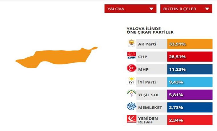 Yalova ayrıca AK Parti, CHP, MHP, İYİ Parti, YSP ve Yeniden Refah Partisi’nin oy oranlarını ise yüzde 0.5- yüzde 3.2 farkla bilen kent oldu.