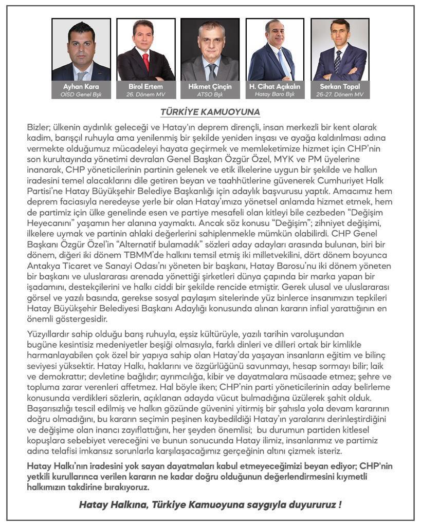 “Amacımız hem deprem faciasıyla neredeyse yerle bir olan Hatay’ımıza yönetsel anlamda hizmet etmek, hem de partimiz için ülke genelinde esen ve partiye mesafeli olan kitleyi bile cezbeden değişim heyecanını yaşamın her alanına yaymaktı. Ancak söz konusu değişim, zihniyet değişimi, ilkelere uymak ve partinin ahlaki değerlerini sahiplenmekle mümkün olabilirdi. CHP Genel Başkanı Özgür Özel’in ‘Alternatif bulamadık’ sözleri aday adayları arasında bulunan, biri bir dönem, diğeri iki dönem TBMM’de halkını temsil etmiş iki milletvekilini, dört dönem boyunca Antakya Ticaret ve Sanayi Odası’nı yöneten bir başkanı, Hatay Barosu’nu iki dönem yöneten bir başkanı ve uluslararası arenada yönettiği şirketleri dünya çapında bir marka yapan bir işadamını, destekçilerini ve halkı ciddi bir şekilde rencide etmiştir. Gerek ulusal ve uluslararası görsel ve yazılı basında, gerekse sosyal paylaşım sitelerinde yüz binlerce insanımızın tepkileri Hatay Büyükşehir Belediyesi Başkan adaylığı konusunda alınan kararın infial yarattığının en önemli göstergesidir. Hatay halkı, haklarını ve özgürlüğünü savunmayı, hesap sormayı bilir, laik ve demokrattır, devletine bağlıdır, ayrımcılığa, kibir ve dayatmalara müsaade etmez, şehre ve topluma zarar verenleri affetmez. Hal böyle iken CHP’nin parti yöneticilerinin aday belirleme konusunda verdikleri sözlerin, açıklanan adayda vücut bulmadığına üzülerek şahit olduk. Başarısızlığı tescil edilmiş ve halkın gözünde güvenini yitirmiş bir şahısla yola devam kararının doğru olmadığını, bu kararın seçimin peşinen kaybedildiği, Hatay’ın yaralarını derinleştirdiğini ve değişime olan inancı zayıflattığını, her şeyden önemlisi; bu durumun partiden kitlesel kopuşlara sebebiyet vereceğini ve bunun sonucunda Hatay ilimiz, insanlarımız ve partimiz adına telafisi imkansız sorunlarla karşılaşacağımız gerçeğinin altını çizmek isteriz. Hatay Halkı’nın iradesini yok sayan dayatmaları kabul etmeyeceğimizi beyan ediyor; CHP’nin yetkili kurullarınca verilen kararın ne kadar doğru olduğunun değerlendirmesini kıymetli halkımızın takdirine bırakıyoruz.”