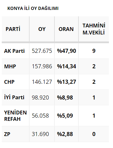 AA verilerine göre 21:39 itibarıyla sandıkların 79,2’sinin açıldığı Konya’da milletvekili dağılımları.