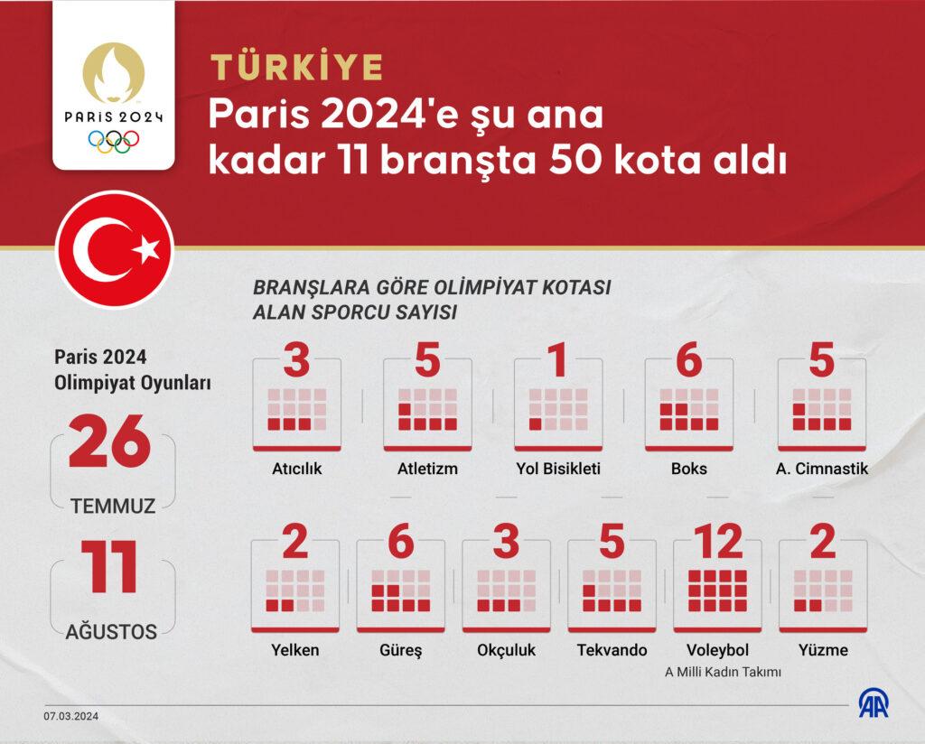 Türkiye Paris 2024’te 11 farklı branşta yer almayı garantiledi. Atıcılık, atletizm, yol bisikleti, boks, artistik cimnastik, güreş, okçuluk, tekvando, voleybol, yelken ile yüzmede milli sporcular Paris’te madalya mücadelesi verecek. Bu branşların yanı sıra diğer olimpik branşlarda da kota müsabakaları sürecek. Bazı branşlarda sporcular dünya sıralamasına göre de kota hakkı elde edebilecek.