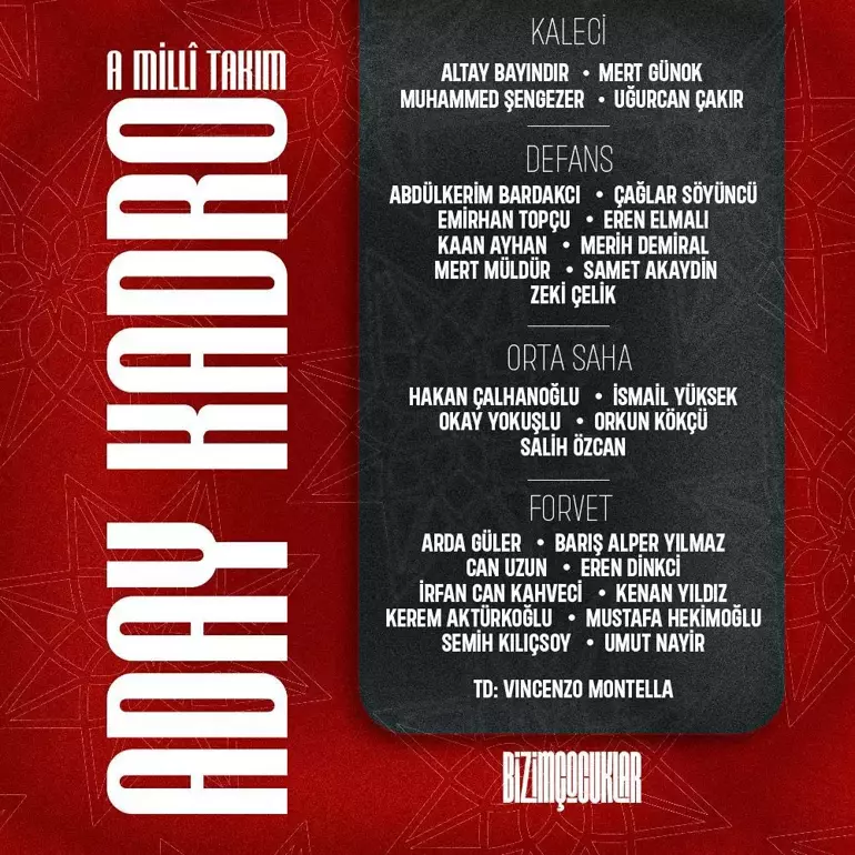 Orta Saha: Yunus Emre Konak (Brentford), Bartuğ Elmaz (Fenerbahçe), Cihan Çanak (Trabzonspor), Livan Burcu (1. FC Magdeburg), Başar Önal (NEC Nijmegen), Burak İnce (WKS Slask Wroclaw)