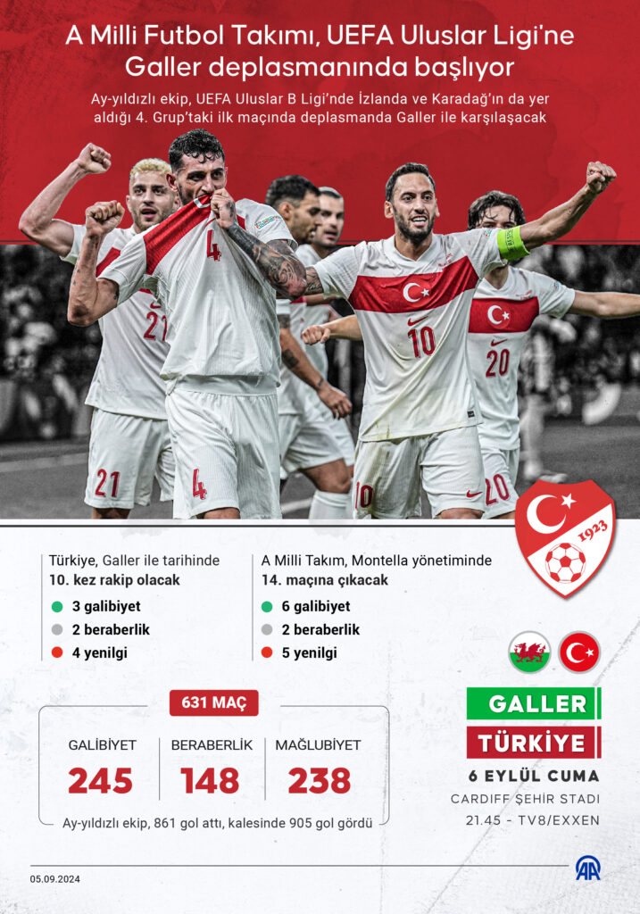 A Milli Takım EURO 2024 sonrası ilk maçında Uluslar Ligi'nin açılışını Galler deplasmanında yapacak. Cardiff Şehir Stadı'nda oynanacak mücadele TSİ 21.45'te başlayacak ve TV8 ekranlarından naklen yayınlanacak.