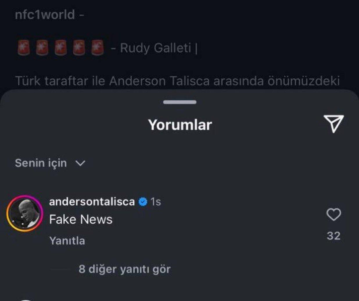 Futbol yaşamını Suudi Arabistan’da sürdüren Talisca ise konu hakkındaki sessizliğini ilk kez bozdu. İtalyan gazeteci Rudy Galleti’nin Instagram hesabı üzerinden “Fenerbahçe, Anderson Talisca’yla anlaştı” haberine Brezilyalı yıldız oyuncudan yanıt geldi.