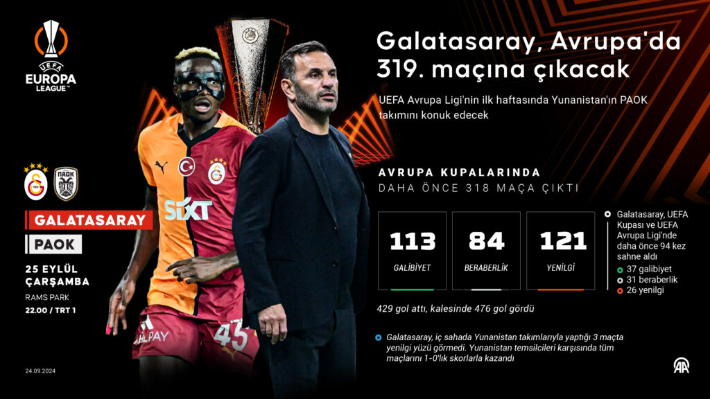 UEFA Avrupa Ligi’nin ilk haftasında Yunanistan’ın PAOK takımını konuk edecek Galatasaray, Avrupa kupalarında 319’uncu mücadelesine çıkacak.