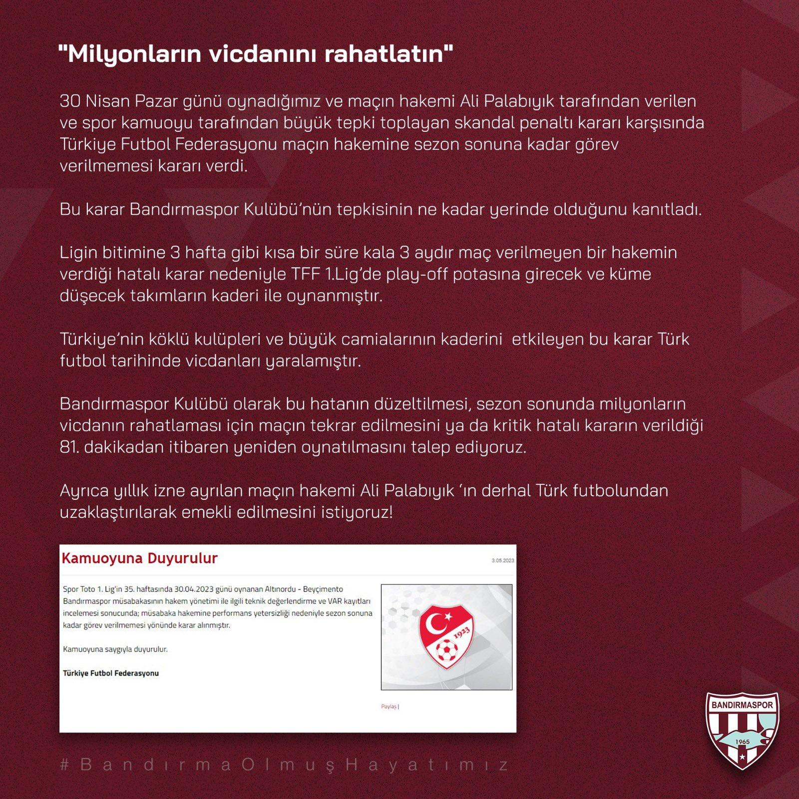 TFF’den yapılan açıklamaya göre Ali Palabıyık’a sezonun geri kalanında herhangi bir görev verilmeyeceği açıklanmıştı. Bandırmaspor kararın üstüne dün gün içinde bir açıklama yayınladı. Bandırma’nın açıklamasında verilen kararın penaltı pozisyonunda hatayı kanıtlar nitelikte olduğu vurgulandı. Bandırmaspor, alınan bu kararın ardından maçın ya tekrarlanması ya da penaltının verildiği 81. dakikadan itibaren tekrar oynanması gerektiğini belirtti. İşte kulüpten yapılan açıklamanın tamamı: