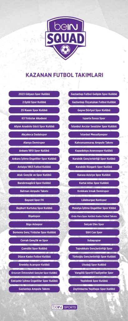 beIN Sports tarafından amatör futbol kulüplerine forma desteği sağlama amacıyla başlatılan beIN Squad projesinde yer alacak 50 takım belli oldu. Kadın, engelli ve erkek takımlarından oluşan liste beIN'in resmi sitesinden duyuruldu.