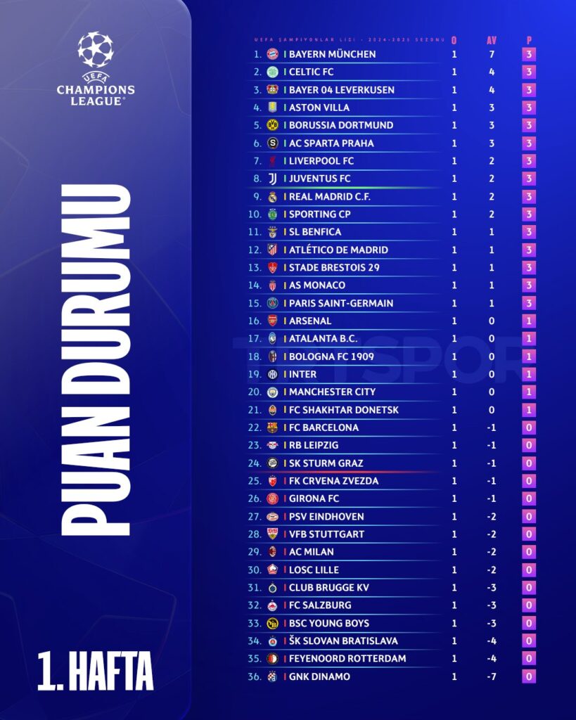 Bu sezon 36 takımlı lig formatına göre düzenlenen Devler Liginde ilk hafta tamamlandı. Avrupa futbolunun kulüpler düzeyindeki bir numaralı turnuvasında oynanan perşembe günü oynanan dört karşılaşmada alınan sonuçlar şöyle: