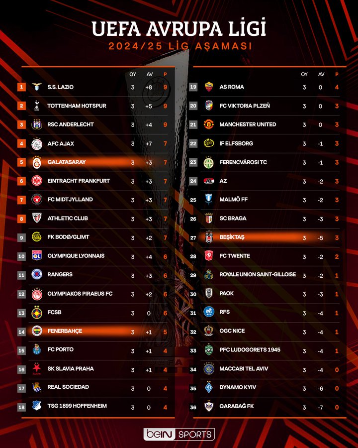 Avrupa Ligi’nde Fenerbahçe’nin Manchester United’la berabere kaldığı gecede 14 ayrı maç daha oynandı. Alınan sonuçlar ve üçüncü haftanın ardından oluşan puan durumu şöyle: