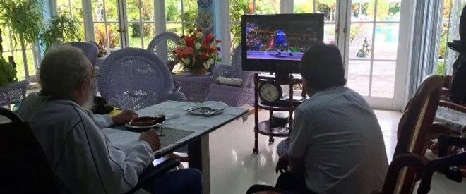 Sağda Morales, solda Fidel ve ekranda Mijain Lopez Nunez-Rıza Kayaalp maçı.