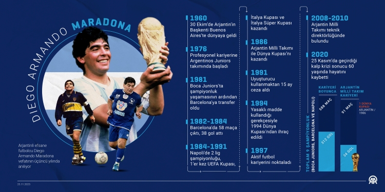 Maradona'nın ölümünün üzerinden üç yıl geçti. Geçirdiği kalp krizi sonrası 25 Kasım 2020’de hayatını kaybeden Arjantinli efsane futbolcu Diego Armando Maradona, vefatının üçüncü yılında anıldı. Futbolculuğu döneminde Boca Juniors, Barcelona ve Napoli formalarıyla farklı kulvarlarda dokuz şampiyonluk yaşayan, Arjantin Milli Takımı’yla 1986 Dünya Kupası’nı kazanma başarısı gösteren Maradona, futbol tarihine adını altın harflerle yazdırdı.