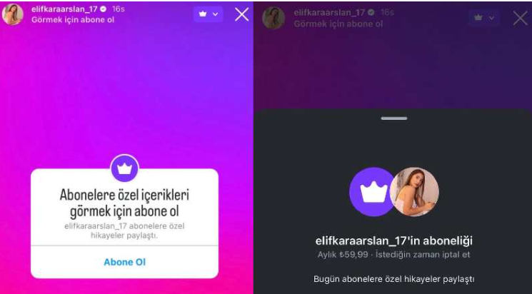 İşte Elif Karaarslan’ın sosyal medya hesabındaki abonelik bölümü.