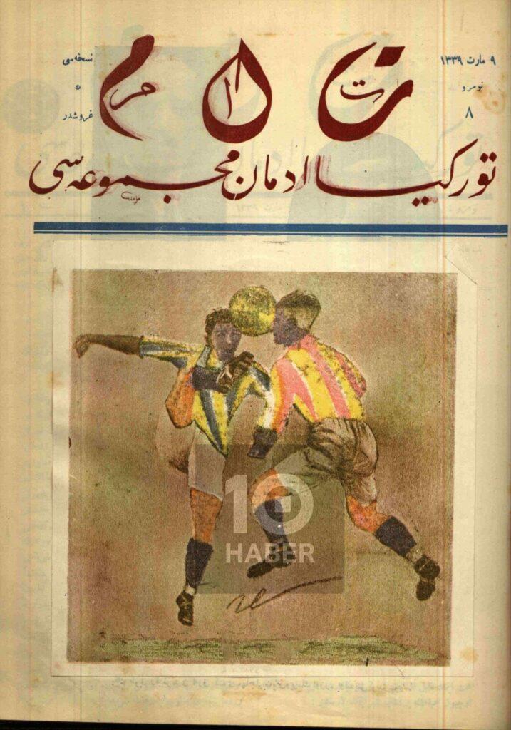 İlk eser 9 Mart 1923 tarihinde yayımlanan Türkiye İdman Mecmuası’ndan zarif bir illüstrasyon. Aynı gün oynanacak Galatasaray-Fenerbahçe maçına geniş yer ayrılan ve adeta derbi özel sayısı niteliği kazanan nüshanın kapağında bir ikili mücadele var. Futbolcuları seçmek çok mümkün değil ama tahmin yapmak gerekirse bu isimler Aslan Nihat Bekdik ve Zeki Rıza Sporel olmalı. Mecmuanın adını, aynı zamanda yazarlarından olan Ali Sami Yen’in reisliğini yaptığı Türkiye İdman Cemiyetleri İttifakı’ndan çağrışımla aldığını da not olarak düşelim.