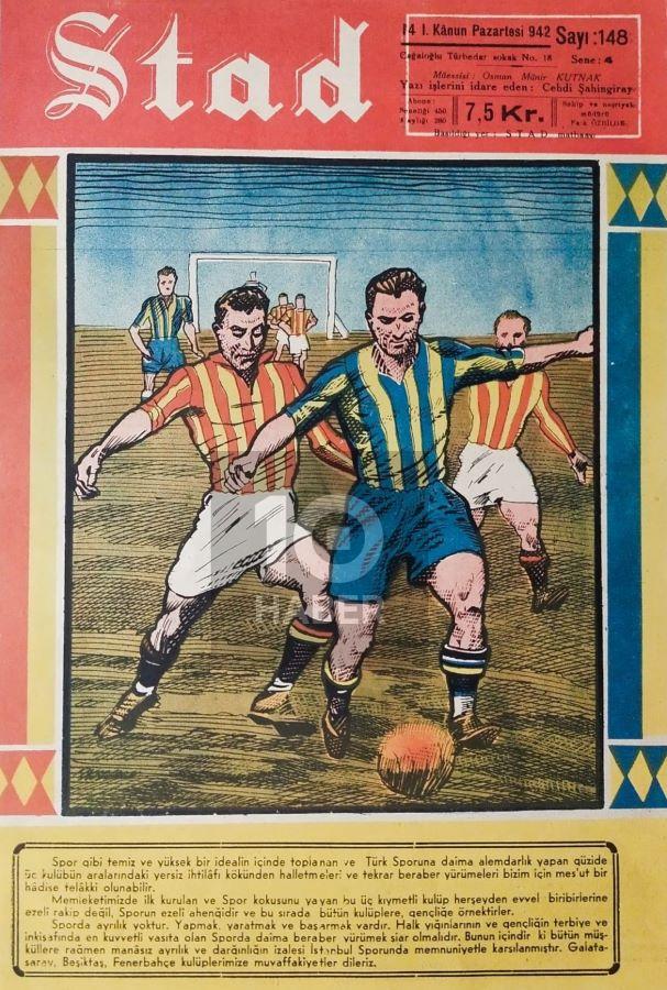 Sıradaki çizimimiz 1942 tarihli Stad dergisinden. Kapakta yine bir Galatasaray- Fenerbahçe mücadelesi var. Olaylı bir derbi sonrası yayımlanan mecmuanın kapağında ise üç büyükler arasında artan gerilime değinilmekte.