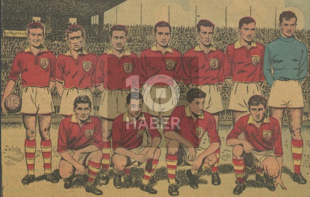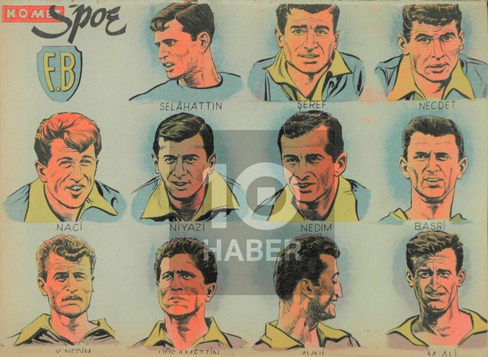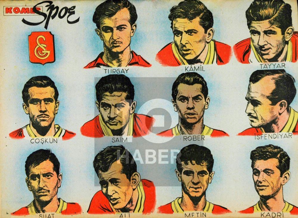 Takım kadroları çizgi dünyasının her daim ilgi alanında yer almış. 1954-1955 sezonunun temsili Galatasaray kadrosunu gösteren bu çalışma Hürriyet gazetesinden. Çizen ise daha ziyade duygusal çizgi romanlarıyla tanınan Faruk Geç.