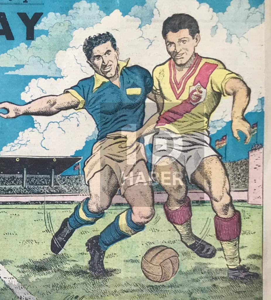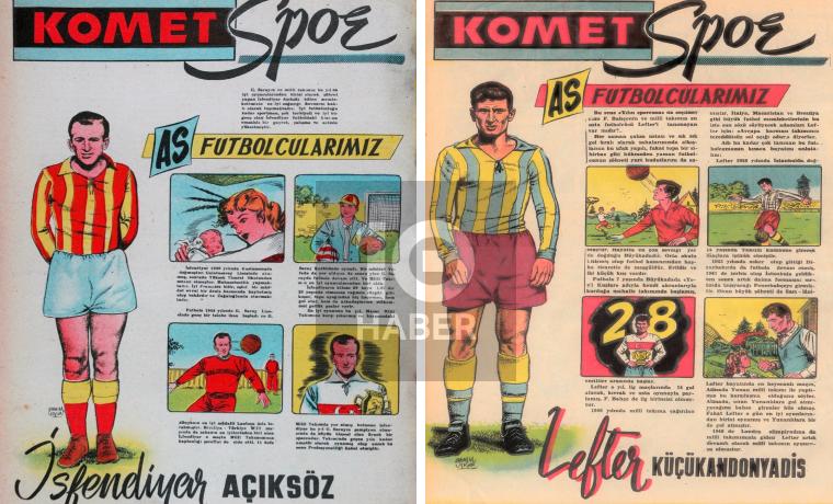 1956’da yayımlanan Komet Gençlik Mecmuası’nda Galatasaray ve Fenerbahçe’ye ait çok değerli çizimler yer almakta. Samim Utkun imzalı bu çalışmalarda iki takımın yıldızlarının hayatları mercek altına alınmış. Galatasaray cephesinden seçilen futbolcu ‘Serçe’ lakaplı İsfendiyar Açıksöz. Fenerbahçe’den ise ‘Ordinaryüs’ lakaplı Lefter Küçükandonyadis’i tercih etmiş Utkun.