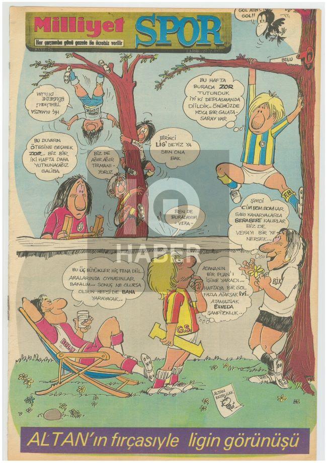 Böyle bir dosya hazırlarken Altan Erbulak’a değinmemek olmaz. Karikatüristliğinin yanı sıra tiyatro ve sinema oyuncusu, gazeteci gibi apoletleri olan Erbulak, 1970’lerde Milliyet Spor’da karşımıza çıkan bu eserinde bir hafta sonra oynanacak derbiye ligin zirvesindeki genel görünüm üzerinden bakmış.