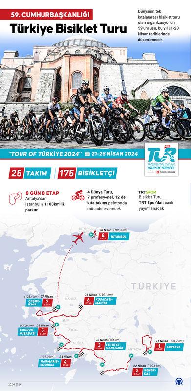 Cumhurbaşkanlığı Bisiklet Turu'nun 59'ncusu başlıyor. Dünyanın tek kıtalararası bisiklet turu olma özelliği taşıyan Cumhurbaşkanlığı Bisiklet Turu’nun 59’uncusu, bu yıl 21-28 Nisan tarihlerinde düzenlenecek. Sekiz etaptan oluşan TUR 2024’te mücadele edecek 25 takımdan 175 bisikletçi, 1188 kilometre boyunca pedal çevirecek. Organizasyon geçen senelerde de olduğu gibi TRT Spor’dan canlı yayımlanacak.
