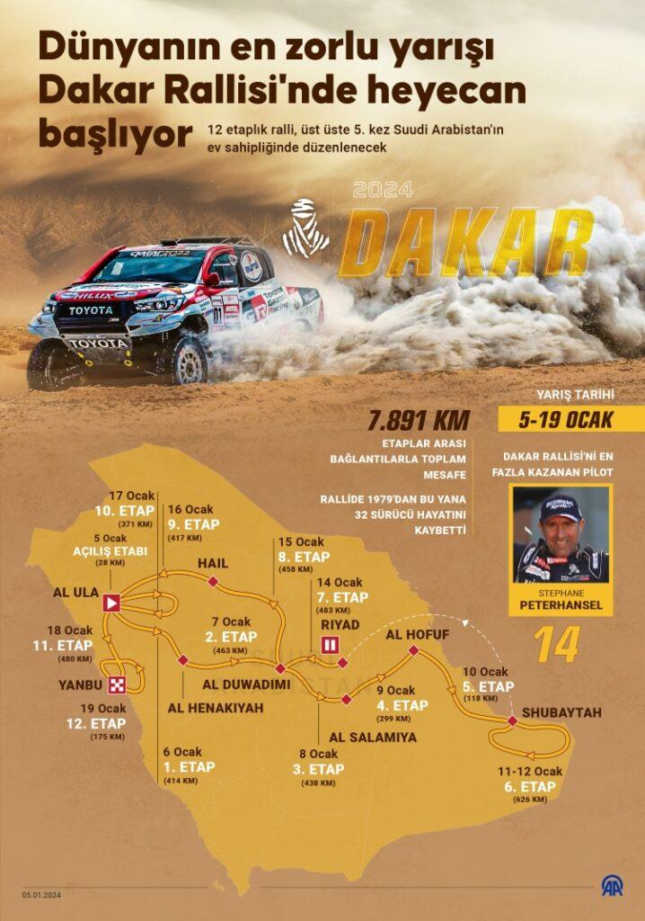 Dakar Rallisi’nin 1. etabı, Al Ula ile Al Henakiyah kentleri arasındaki 414 kilometrelik parkurda düzenlenecek. 2024 Dakar Rallisi, 19 Ocak’ta Yanbu kentinde son bulacak.