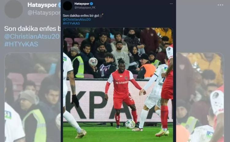 Hatayspor’un resmi hesabından 5 Şubat’ta atılan mesajda Atsu fotoğrafı ve ‘Son dakikada enfes bir gol’ yazısı vardı.