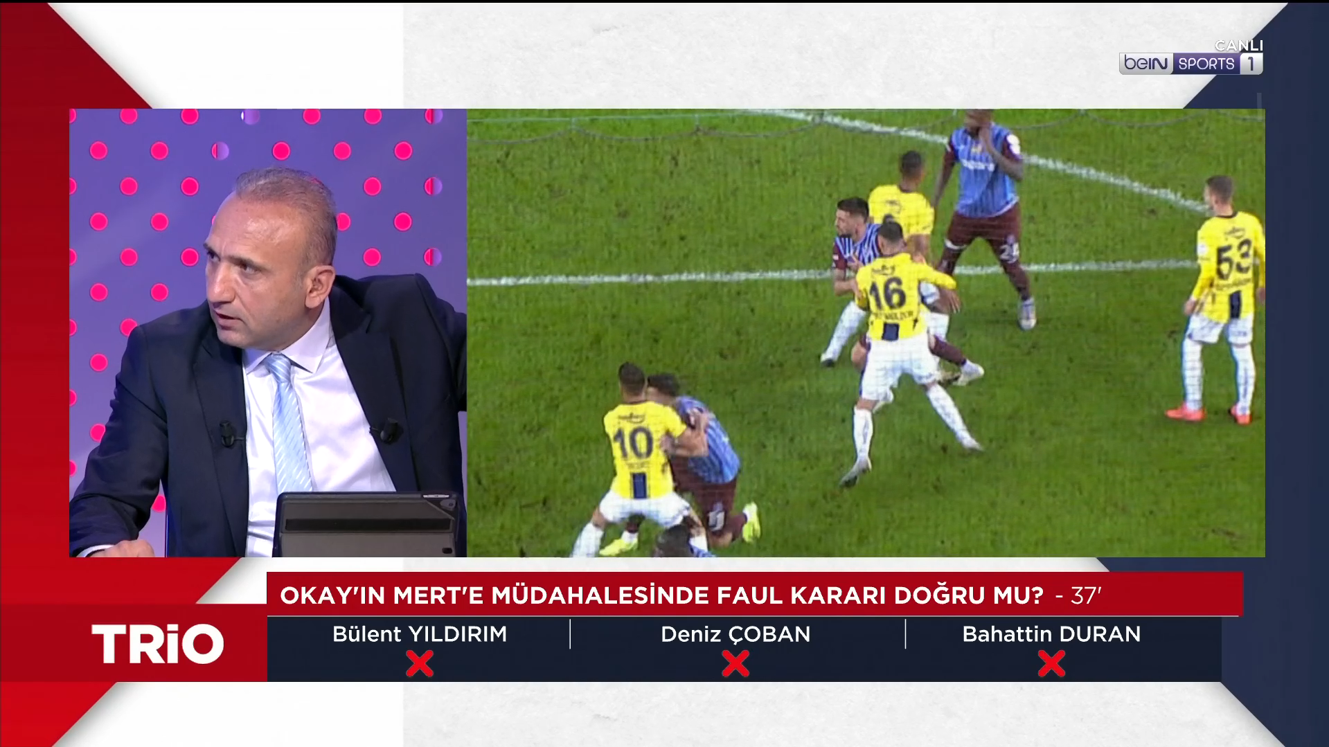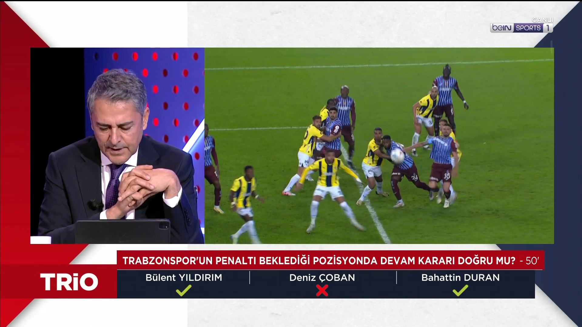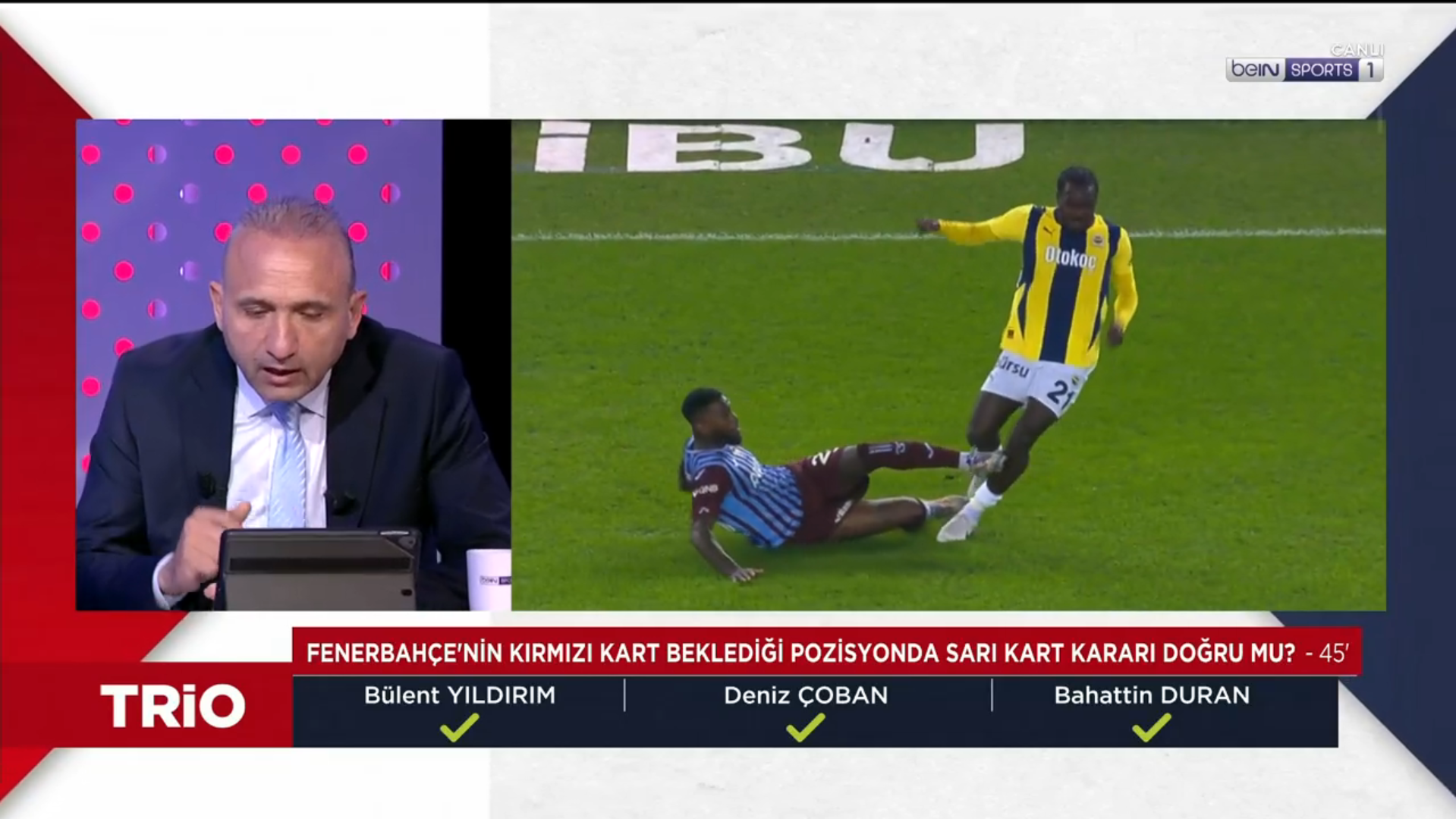 Trabzonspor-Fenerbahçe maçının tartışmalı kararları TRIO'da değerlendirildi. Fenerbahçe, Trabzonspor’u deplasmanda 3-2 mağlup etti. Karşılaşmaya genç hakem Oğuzhan Çakır’ın çaldığı ve çalmadığı düdüklerin yanı sıra VAR hakemi Atilla Karaoğlan’ın müdahaleleri damga vurdu. Mücadeledeki tartışmalı pozisyonlar beIN Sports’taki TRIO programında masaya yatırıldı. Bahattin Duran, Bülent Yıldırım ve Deniz Çoban görüşlerini açıkladı. İşte Türkiye’nin FIFA kokartlı üç eski hakeminin Trabzonspor-Fenerbahçe maçındaki tartışmalı pozisyonlara dair görüşleri: