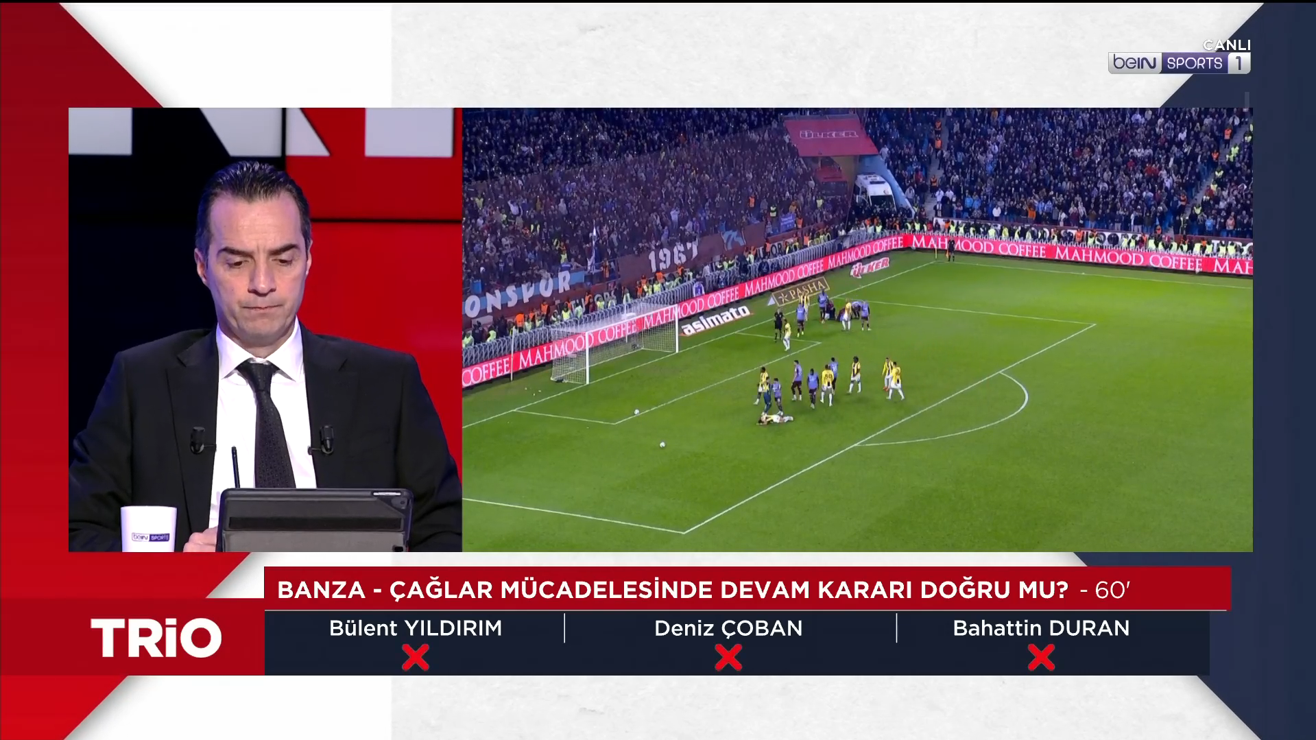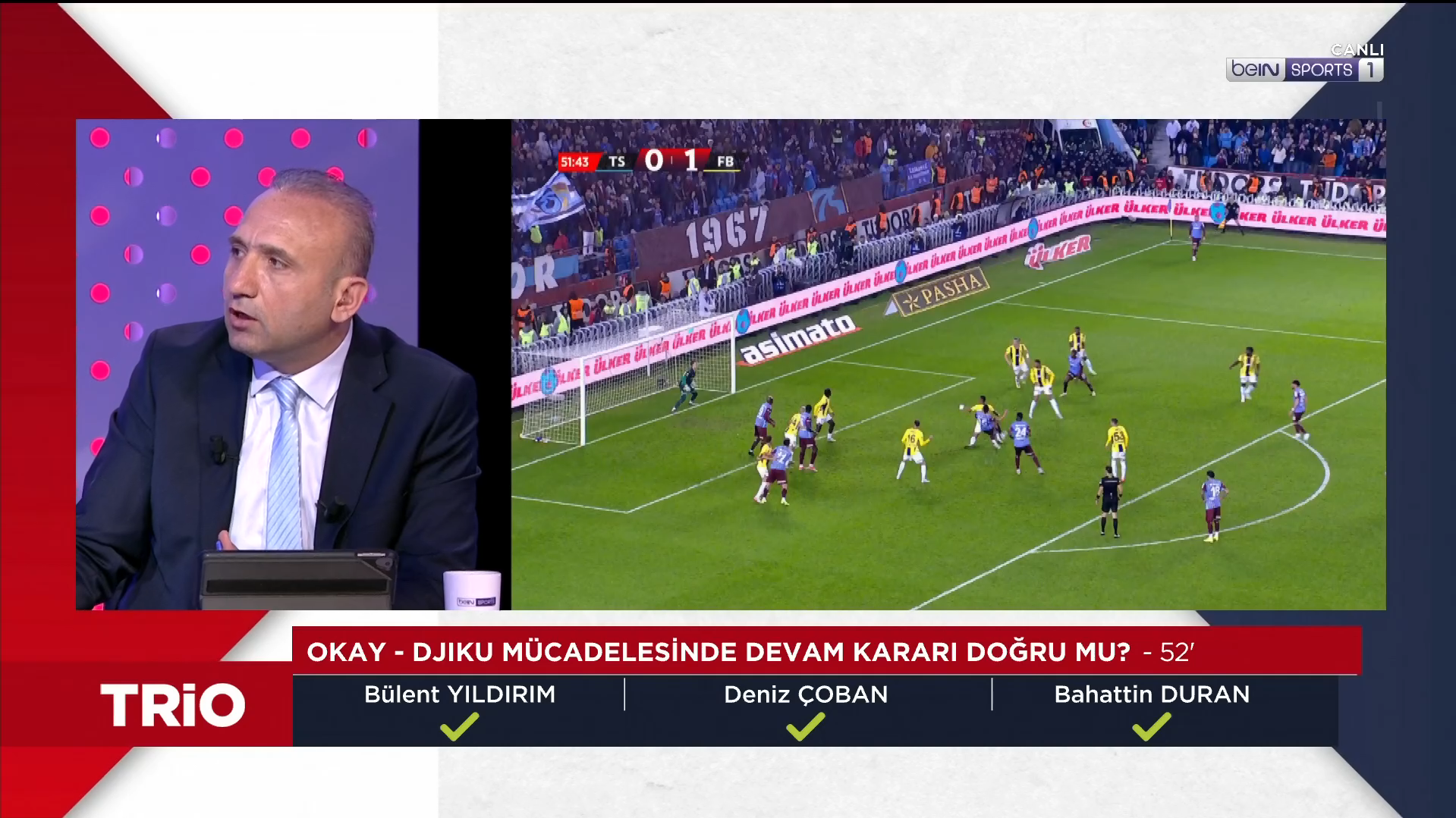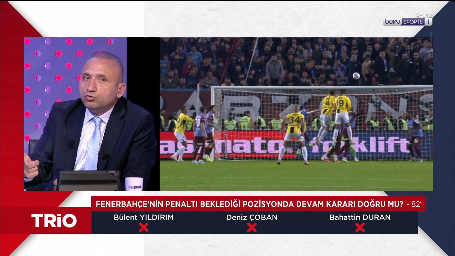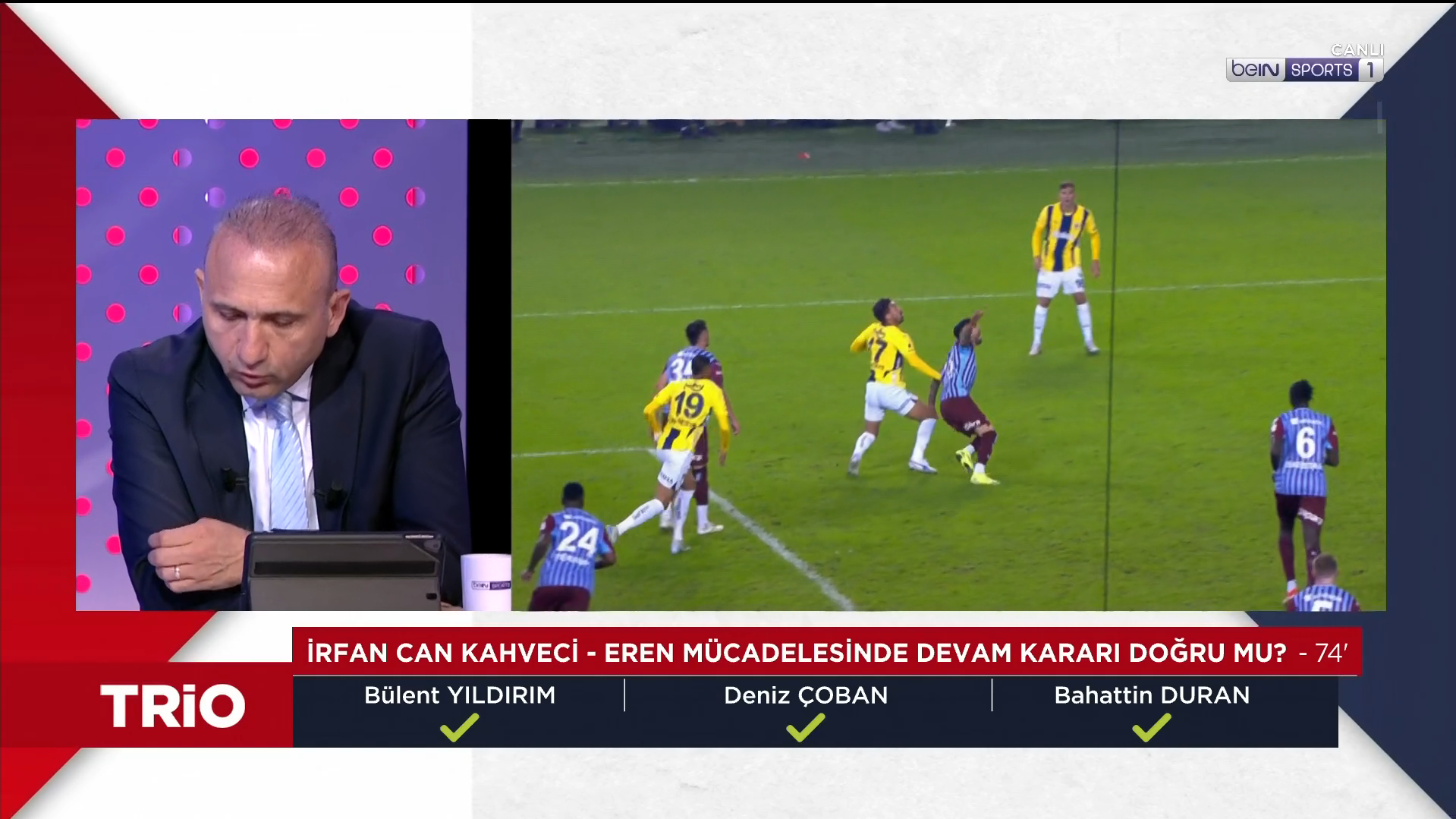 Trabzonspor-Fenerbahçe maçının tartışmalı kararları TRIO'da değerlendirildi. Fenerbahçe, Trabzonspor’u deplasmanda 3-2 mağlup etti. Karşılaşmaya genç hakem Oğuzhan Çakır’ın çaldığı ve çalmadığı düdüklerin yanı sıra VAR hakemi Atilla Karaoğlan’ın müdahaleleri damga vurdu. Mücadeledeki tartışmalı pozisyonlar beIN Sports’taki TRIO programında masaya yatırıldı. Bahattin Duran, Bülent Yıldırım ve Deniz Çoban görüşlerini açıkladı. İşte Türkiye’nin FIFA kokartlı üç eski hakeminin Trabzonspor-Fenerbahçe maçındaki tartışmalı pozisyonlara dair görüşleri: