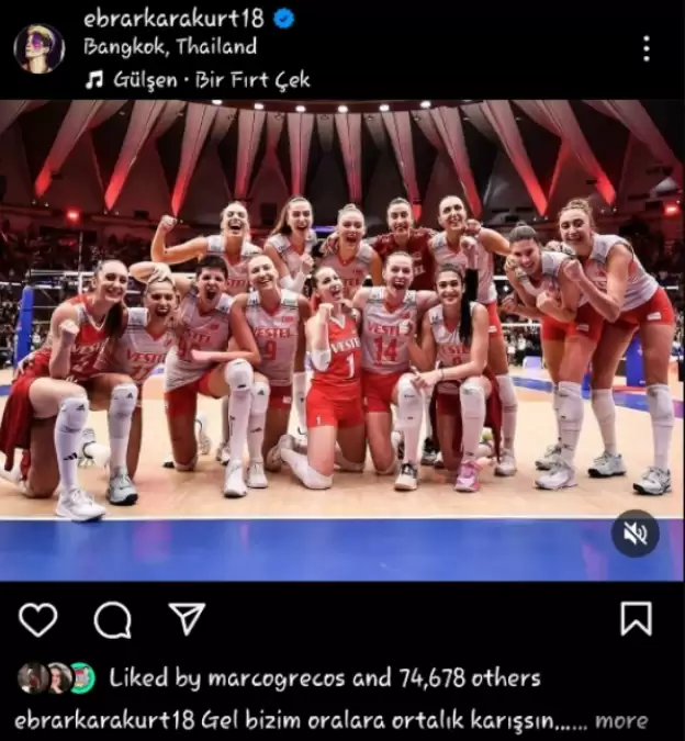 Ebrar Karakurt, Brezilya karşısında çok iyi bir oyun ortaya koydu. Filenin Suytanları Uluslar Ligi’nde Brezilya’yı 3-0 yenerek final gruplarına 3. sıradan girme yolunda büyük bir adım attı. Karşılaşma sonrası Ebrar Karakurt sosyal medya hesabı Instagram’dan bir paylaşımda bulundu. Oyuncu, Gülşen’in ‘Bir fırt çek’ şarkısını “Gel bizim oralara ortalık karışsın” sözleriyle paylaştı.
