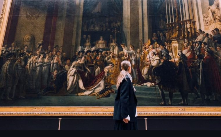 Celine Dion, Louvre Müzesi’nde gezerken ressam Jacques Louis David imzası taşıyan devasa boyuttaki ‘Napoleon’un Taç Töreni’ tablosu önünde fotoğraf çektirdi.