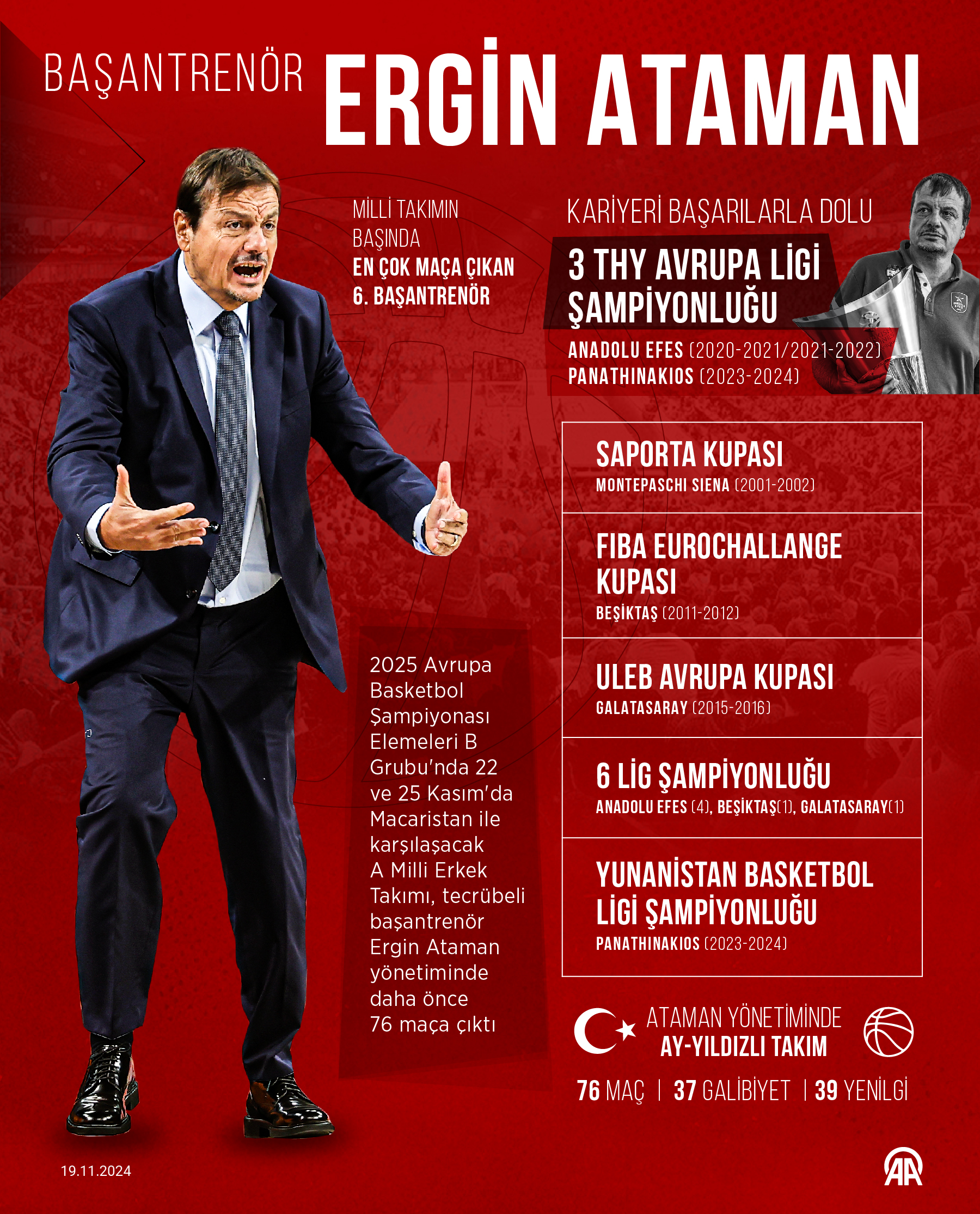 2025 Avrupa Basketbol Şampiyonası Elemeleri B Grubu’nda 22 ve 25 Kasım’da Macaristan ile karşılaşacak A Milli Erkek Takım tecrübeli başantrenör Ergin Ataman yönetiminde daha önce 76 maça çıktı.