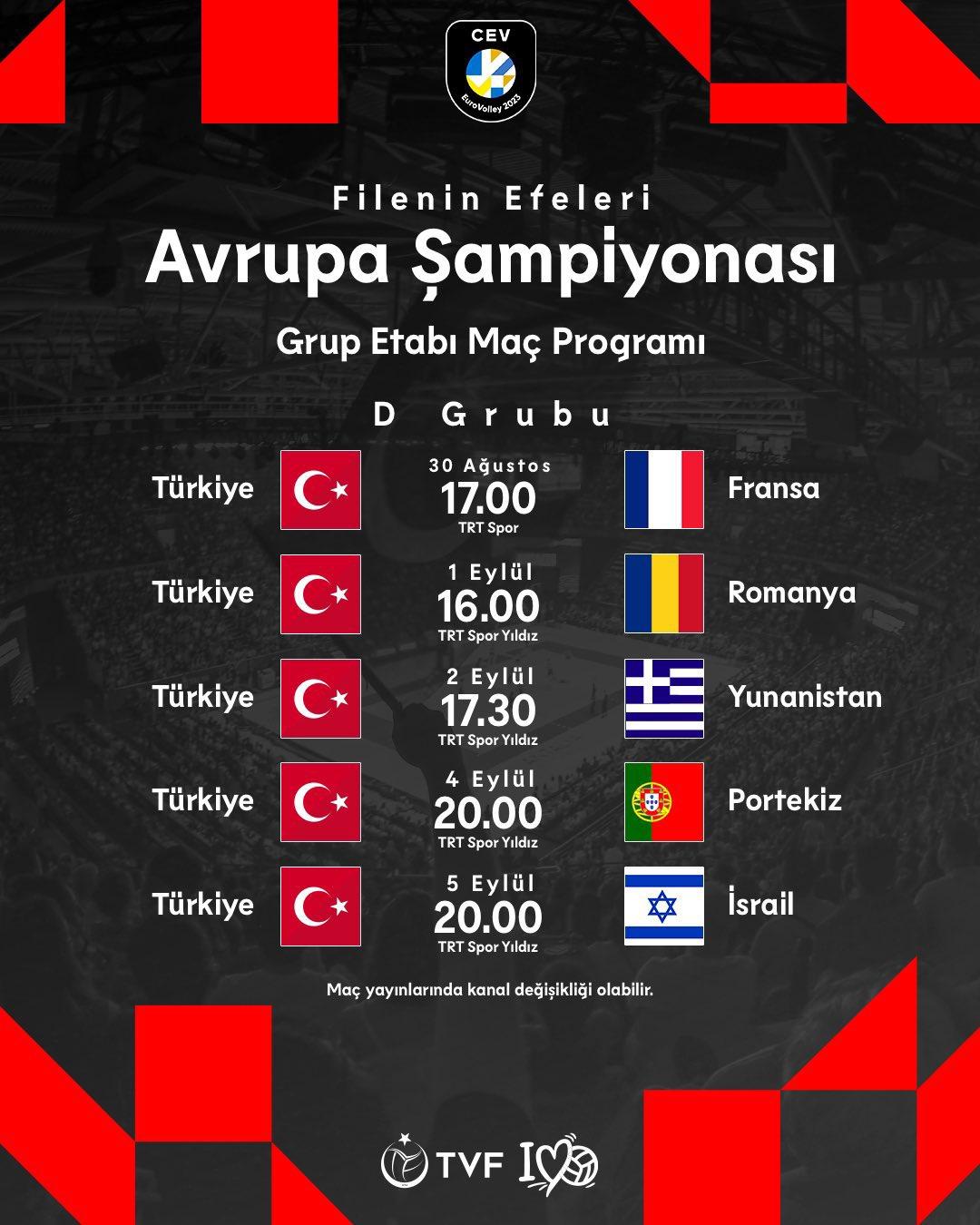 İtalya, Bulgaristan, Kuzey Makedonya ve İsrail'in ev sahipliği yapacağı 2023 CEV Erkekler Avrupa Voleybol Şampiyonası bugün başlıyor. Türkiye, İsrail'in ev sahipliği yapacağı D Grubu'nda yer alıyor.