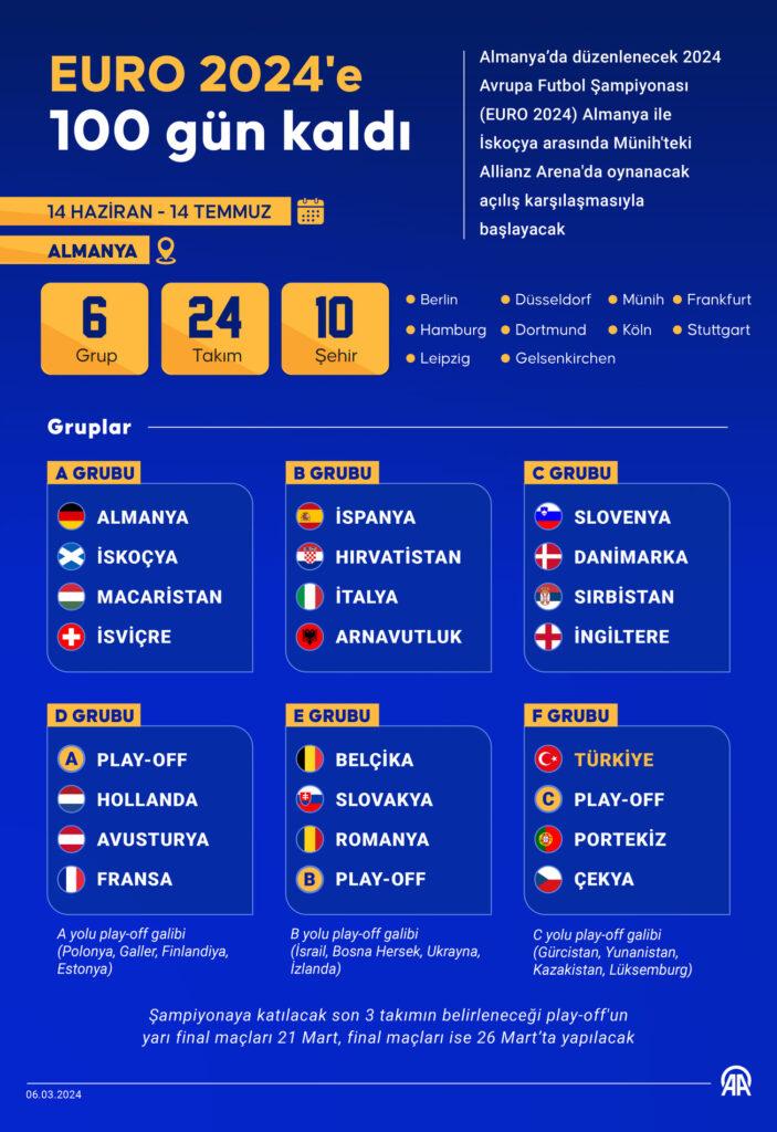 A Milli Futbol Takımı EURO 2024 F grubunda Portekiz, C yolu play-off galibi (Gürcistan, Yunanistan, Kazakistan, Lüksemburg) ve Çekya ile mücadele edecek. Ay-yıldızlılar ilk maçında C yolu play-off galibiyle 18 Haziran Salı günü Dortmund’da karşılaşacak. Play-off’taki Gürcistan-Lüksemburg ve Yunanistan-Kazakistan eşleşmelerinin ardından finali kazanacak takım, Türkiye’nin rakibi olacak. Milli takım, gruptaki ikinci maçını 22 Haziran Cumartesi günü Portekiz ile Dortmund’da, üçüncü karşılaşmasını ise 26 Haziran Çarşamba günü Çekya ile Hamburg’da oynayacak.
