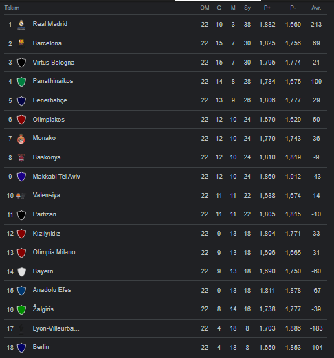 EuroLeague’de 22. hafta sonu oluşan sıralama bu şekilde.