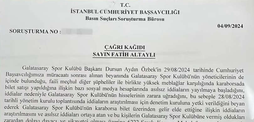 YouTube kanalında iddialarını dile getiren Altaylı hem Dursun Özbek’in İstanbul Cumhuriyet Başsavcılığına verdiği ifade tutanağını, hem de Basın Suçları Soruşturma Bürosu’nun kendisine ilettiği çağrı kağıdını paylaştı. Altaylı konuyla ilgili şöyle dedi: